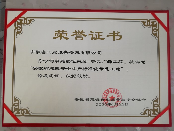近日,安徽安裝承建的淮北恒基城開(kāi)元廣場(chǎng)項目榮獲“安徽省建筑安全生產(chǎn)標準化示范工地”稱(chēng)號,為公司在安全生產(chǎn)方面樹(shù)立了良好的企業(yè)形象。